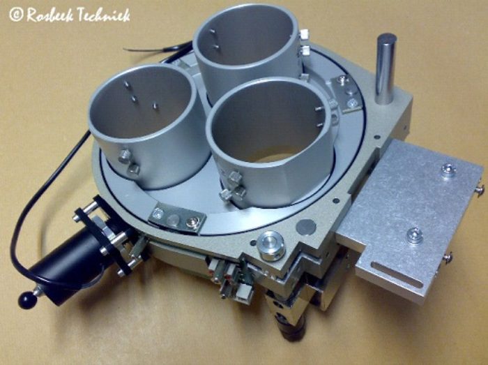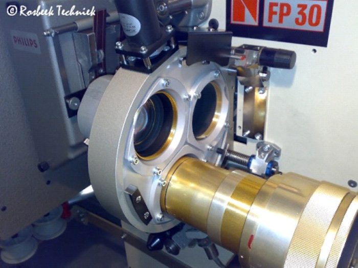 In the late seventies Kinoton began producing FP30 projectors . The parts used were manufactured with the then known technology. The FP30 was usually provided with a turret for two lenses. The changing of the lenses proceeded very roughly and also changing the aperture was very primitive. There is a possibility to provide an older projector with a modern, electronically controlled turret, which can also contain three lenses instead of two. For this reason the film gate and projector cabinet has to be adjusted. This photo series shows the work.